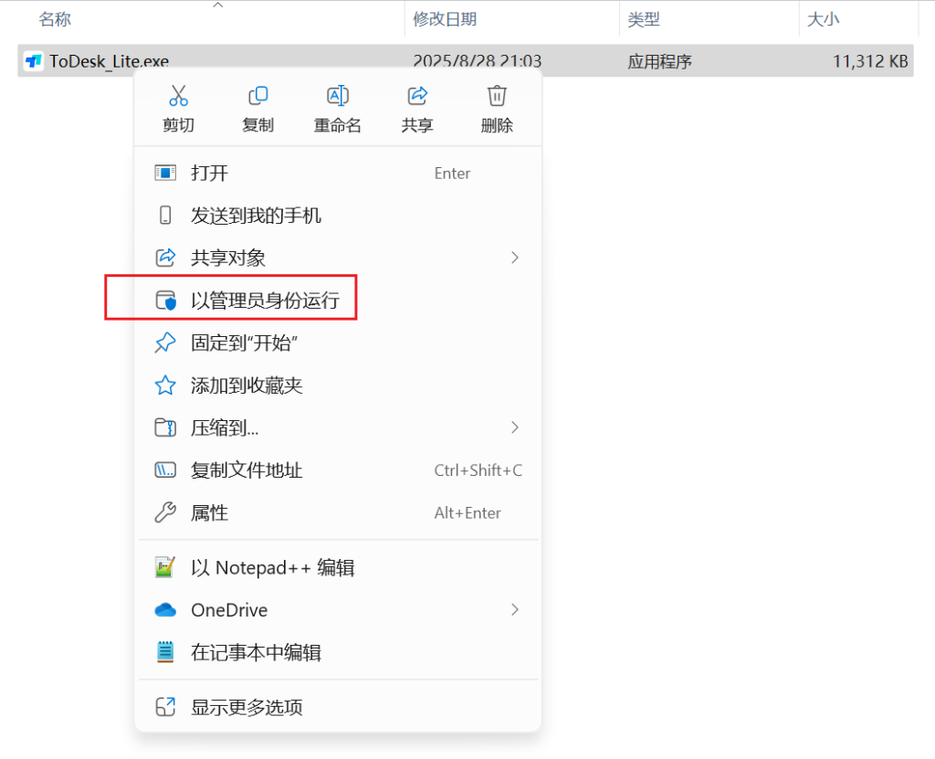 选中下载的ToDesk_lite.exe文件,然后打开鼠标右键,选择以管理员身份运行